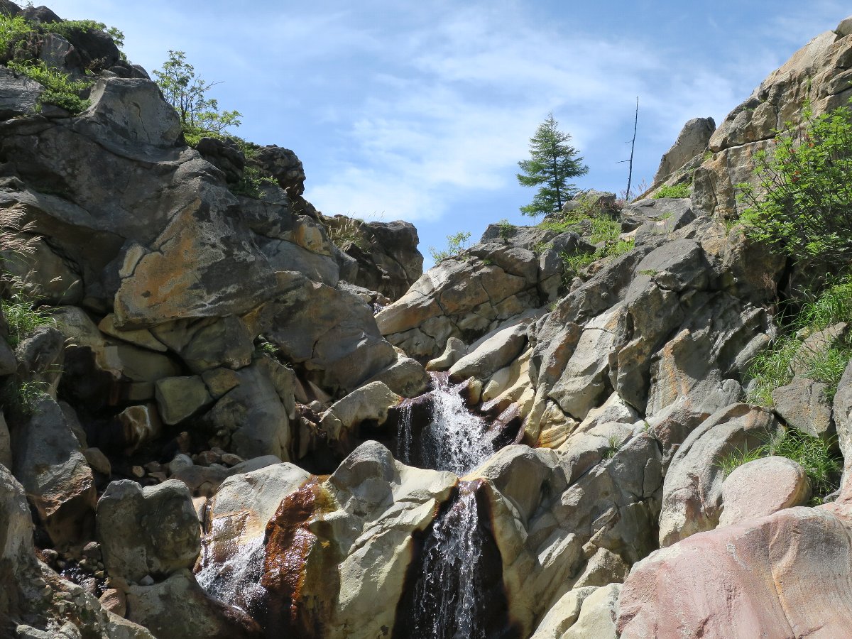 しばらく滝状の急流が続きますが、登りやすい右側の岩が白っぽい箇所はところどころお湯がしみだしており、迂闊に手をつくと熱いこともあります。