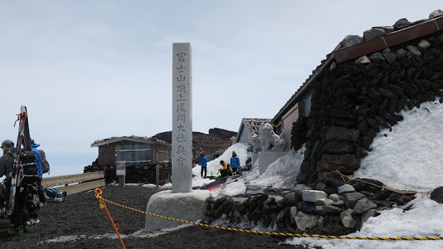 山頂石柱の20メートルくらい下にある物置小屋の様な建物の横でスキーを装着し、登山道上の雪をちょっとの区間滑り、一気にお釜の中へ。