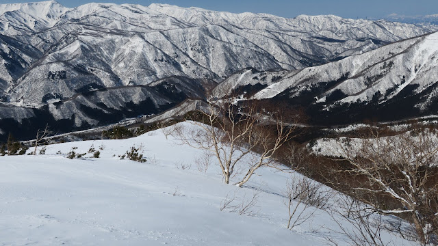 山の家の方から続いてくる尾根まではもうひと頑張りですが、樹林限界より上に出ると、雪面は固くなり、ところどころでブッシュも顔を出してきます。