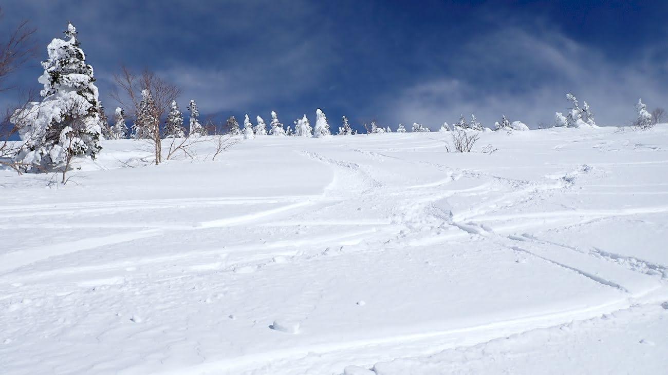 このピークの向こう側の北~北西斜面は、先ほどの斜面よりは滑る人が少ないことを期待します。