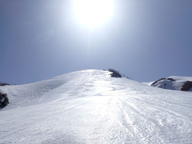 真上に見える岩稜の一番右の岩塊の右に行きたいところですが、雪面の右側はずっとブッシュが出ており、ブッシュ漕ぎをしなくてはいけません。