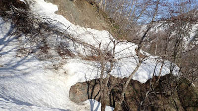 快晴で気温が上昇してきたこの日は、午前10を過ぎたころから不帰嶮周辺の標高2000m超えの尾根からは断続的に底雪崩が発生しており、ごく稀に谷底まで到達してきました。